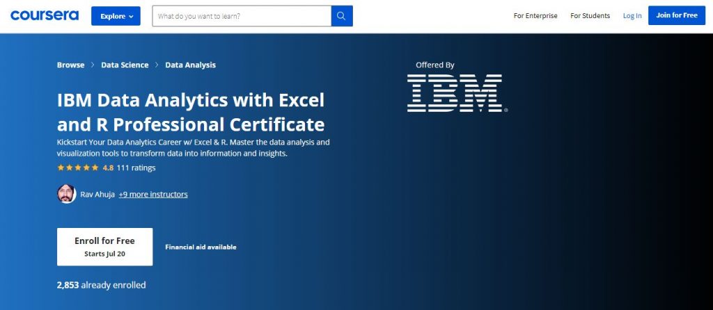 Another professional certificate course on our list and this time it is by IBM will focus on R Programming fundamentals, using Excel Spreadsheet to analyze data, statistical analysis, and many other significant areas. This is one of those programs that makes you job-ready and helps develops necessary skills.