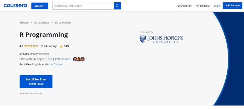 Learning R Programming can be of great help to students seeking a future in the field of Data Science or Software Engineering. Whether you are aware of the other programming languages and now want to begin with R, or have completely no knowledge of programming, Coursera has a special course for everyone and meets every student’s requirements. These courses listed below in our article are not only top-rated by students and provided by renowned institutions, but also will help develop an in-depth knowledge of R programming and make you a master of it.