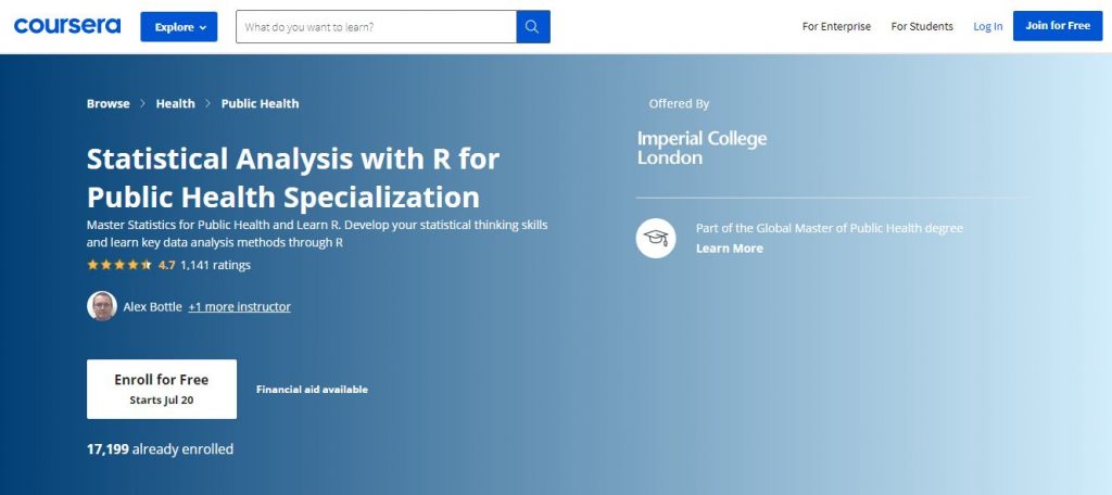 A course organized by the prestigious Imperial College of London focuses on Statistical Analysis by using R as the programming language. Since the field of Statistics is multidisciplinary and is associated with almost every field, this program links it to the discipline of Public Health, and how statistical data is an important part.