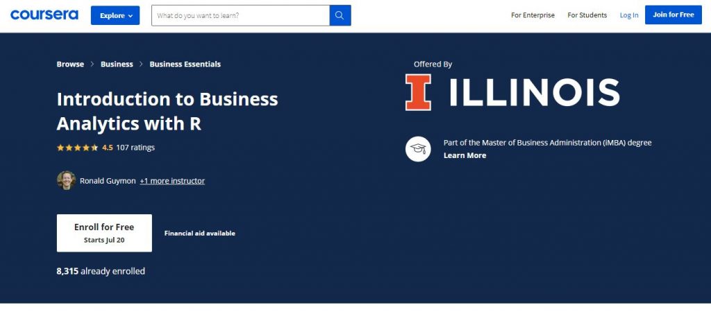 The Introduction to Business Analytics with R offered by the University of Illinois is ideally for those professionals who need a better understanding of business analytics and get familiar with analytics tools.