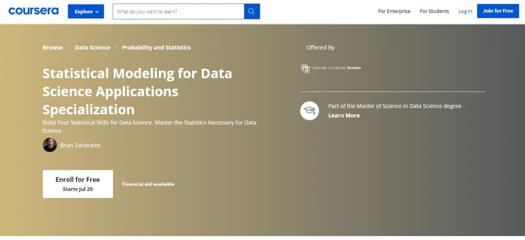 An intermediate-level course offered by the University of Colorado Boulder requires prior knowledge of Calculus, Linear Algebra, and Probability theory to gain a comprehensive understanding of the specialization program. This program will take approximately 4 months to complete, and financial aid is provided to make it easy for students to avail themselves. The key skills one can learn from this program include R programming, Linear Algebra, Regression, creating Statistical models, Calculus and probability theory.