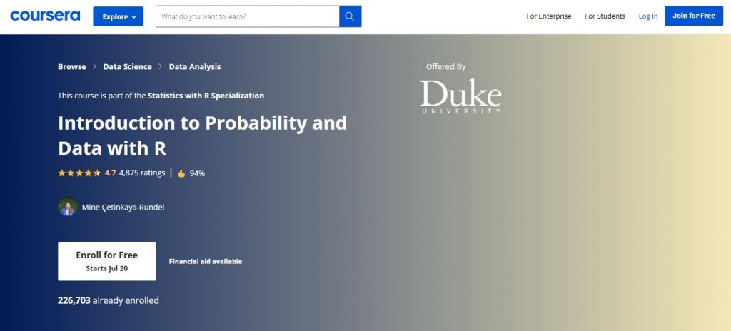 Yet another course by Duke University on our list is ideally designed for individuals wanting to gain knowledge in Data Science, Probability, and R programming. This course is a part of the Statistics with R Specialization program and will cover basic probability theory, data analysis techniques, installing and using R and RStudio, and other important areas necessary to know while beginning with Data Science and Probability. This course will work as the building block for your future with Data Science. It will take approximately 14 hours to complete the course and there is also an availability of Financial Aid.