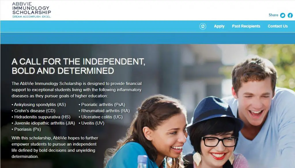 The AbbVie Immunology Scholarship is offered by the organization to financially support students who are suffering from autoimmune or inflammatory diseases such as, Ankylosing spondylitis (AS), Crohn’s disease (CD), Rheumatoid Arthritis, Uveitis (UV), and so on. This scholarship is provided with the sole aim to help these students to achieve their educational goals, and lead an independent, bold life in the future. A disease may affect your body, but it is you who has control over everything and can bring a positive change by focusing on both your health and education, to build a better tomorrow. The 2022-2023 application dates are soon to be revealed.