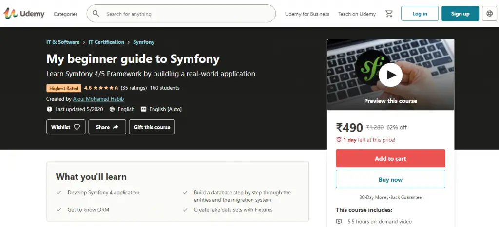 This course with a rating of 4.6 on the platform of Udemy will help you learn Symfony the powerful PHP framework that would let you create not only websites but great web applications, APIs, or mobile backends. Its latest version is the most powerful, yet simplest to use for developers. If you want to get started with Symfony, this is the best place you could get. The key features of the course include: