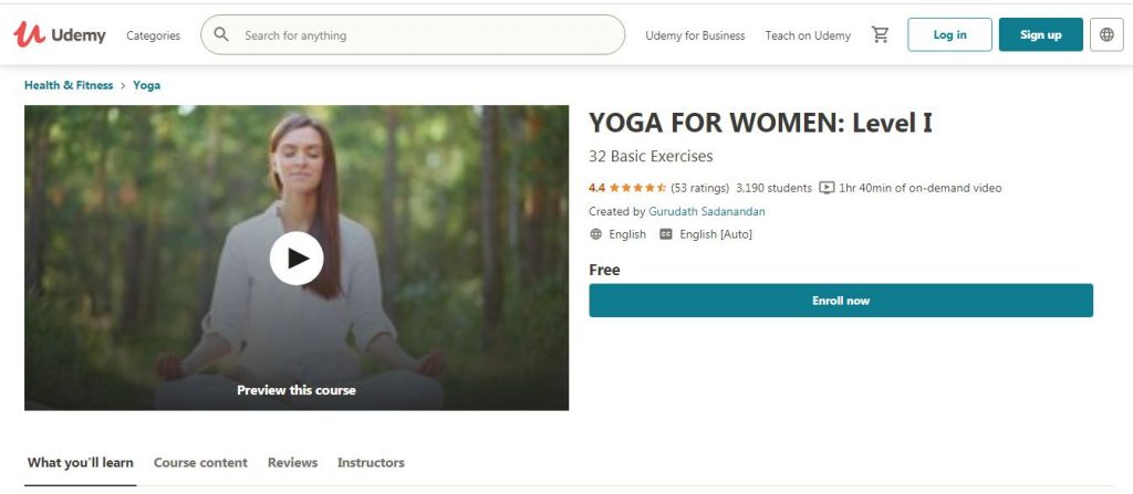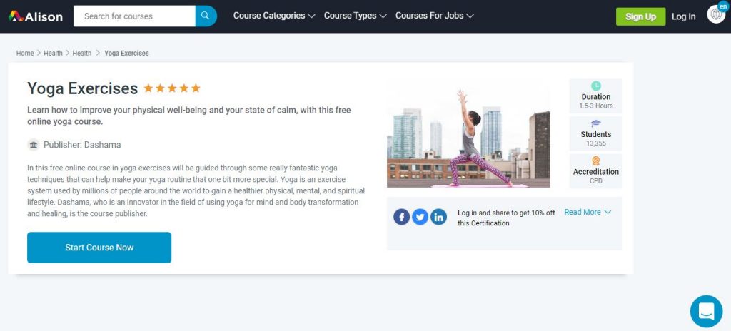This wonderful short yoga course on Alison by Dashama has enrolled almost 10,000 students. It starts with teaching students how to stretch their hamstring, hip, and shoulder correctly then moves on to stomach massages. Lean body stretching and inner thigh flexibility, as well as Pranayama yoga breathwork and sun salutation, will be taught to participants. After that, students will be guided through each posture of Sivananda yoga, a gentle, slower-paced style of yoga that emphasizes meditation, breathing, and chanting. There are a total of 15 short modules. You can take the course for free, but if you want certification, you can pay a little amount at the Alison shop.