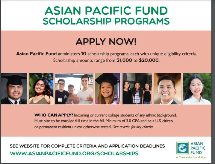 The Asian and Pacific Islander American Scholarship Fund (APIASF) is the country’s biggest 501(c)3 non-benefit association that gives grants to Asian and Pacific Islander Americans (APIAs) with monetary needs. Candidates should enlist for a free record on the grant supplier’s site to finish the application. Candidates should be of Asian as well as Pacific Islander identity as characterized by the U.S. Enumeration, be a resident, public, or lawful super durable inhabitant of the United States, have a base combined GPA of 2.7 on a 4.0 scale and be enlisting as an undergraduate student in the U.S. authorized school or college in the Fall of the year the grant is advertised. Candidates should apply for a government monetary guide utilizing the Free Application for Federal Student Aid (FAFSA). Should submit one letter of recommendation online.