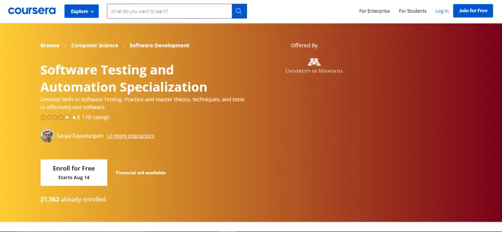 Offered by Coursera, this Software Testing and Automation Specialization is a top-class course instructed by the top faculties of one of the best Ivy League colleges- the University of Minnesota. Kevin Wendt teaches the course. He is the Director of Graduate Studies, Software Engineering Center of the University of Minnesota.