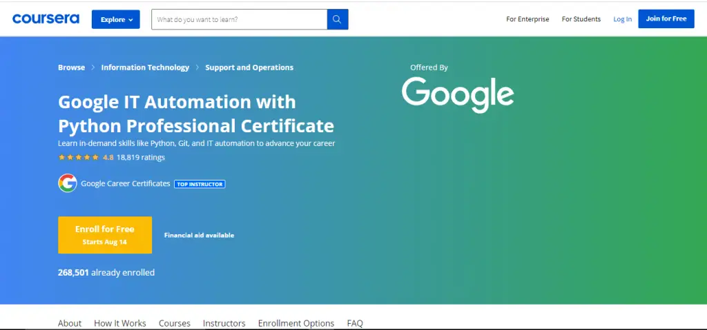 This certificate can be completed in about six months and is designed to prepare you for various roles in IT, like more advanced IT Support Specialist or Junior Systems Administrator positions. There are a total of 6 courses in this professional certificate. You have to complete all six to get the certificate. There are a total of 270000 students enrolled in this course.