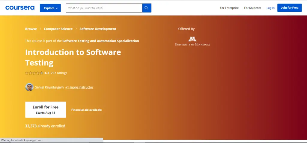 This course is tailor-made for newbies who want to get an idea of software testing. The University of Minnesota offers this course through Coursera. There are a total of 35000 students enrolled for this course alreadySaSanjai Rayadurgam instructs the course the Director of the software engineering center of the University of Minnesota.