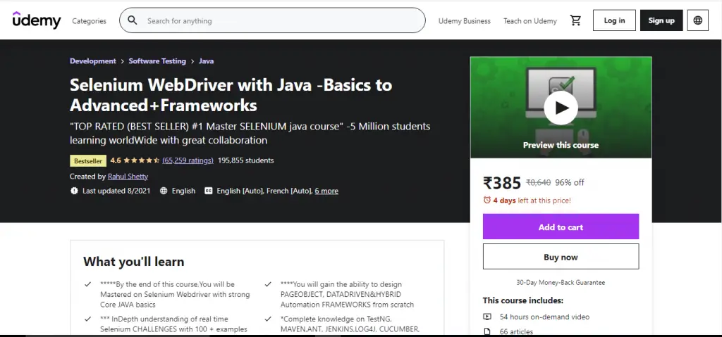 How can I miss this Selenium WebDriver with Java -Basics to Advanced+Frameworks program in an article mentioning the top 10 software testing courses? This program is the number one bestselling course on selenium java training. The course is constantly updated every month with new features, and it has a whopping 4.6-star rating with nearly 2 00,000 students.