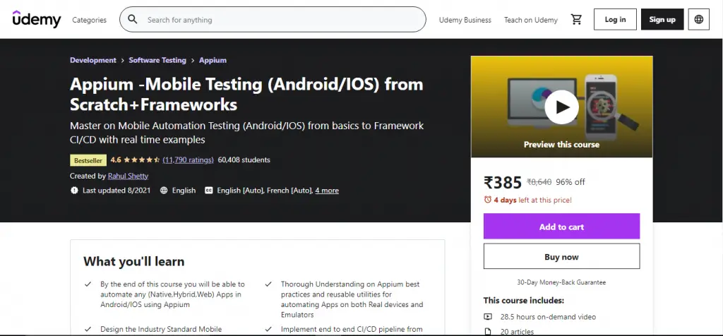 There are a total of 60k students enrolled for this course. Additionally, you will learn the coding standards in writing the most optimized Mobile Automation Scripts. The course is instructed by one of the top instructors on Udemy, Rahul Shetty. His start-up RahulShettyAcademy.com is an emerging online educational platform with significant future potential. This course is highly recommended.